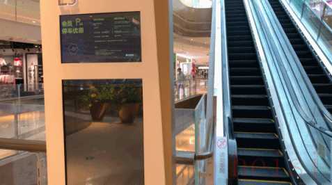 磐基名品中心電梯扶手兩側(cè)的透明擋板均有設(shè)計(jì)高約1米、寬約10厘米的凹陷,視覺效果美觀,但高度過低,易于攀爬且沒有醒目的安全告示,有一定的安全隱患。