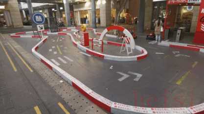 在阿羅海城市廣場(chǎng)南邊的步行街,一家“跑跑迷卡”賽車體驗(yàn)館,用低矮的隔離帶將門前有限的位置圍成了一片賽道,隔離帶上張貼的彩色膠帶上標(biāo)注了“賽道有車通行,嚴(yán)禁進(jìn)入賽道”。步行街上來往行人眾多,都不得不避開跑道,影響了購物體驗(yàn)。