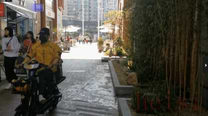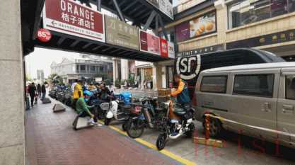 而在鄰近鎮(zhèn)海路的中華城外街,街道入口處擺放著“汽車、自行車、電動(dòng)車禁止駛?cè)胪饨帧钡奶崾九?,但不時(shí)能看到電動(dòng)車尤其是外賣車駛?cè)耄谌巳褐写┧蟆?/strong>