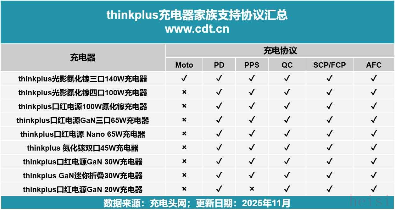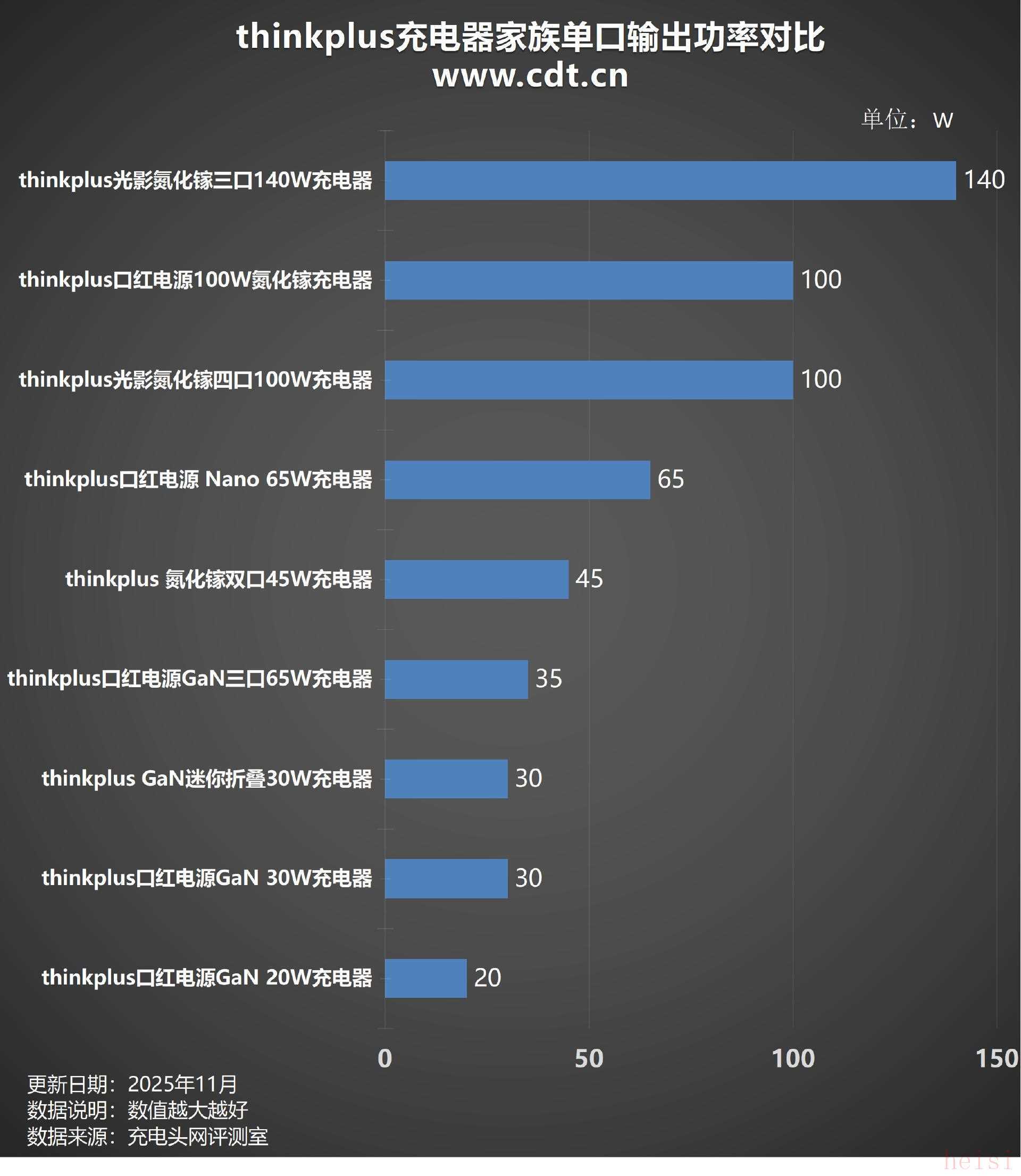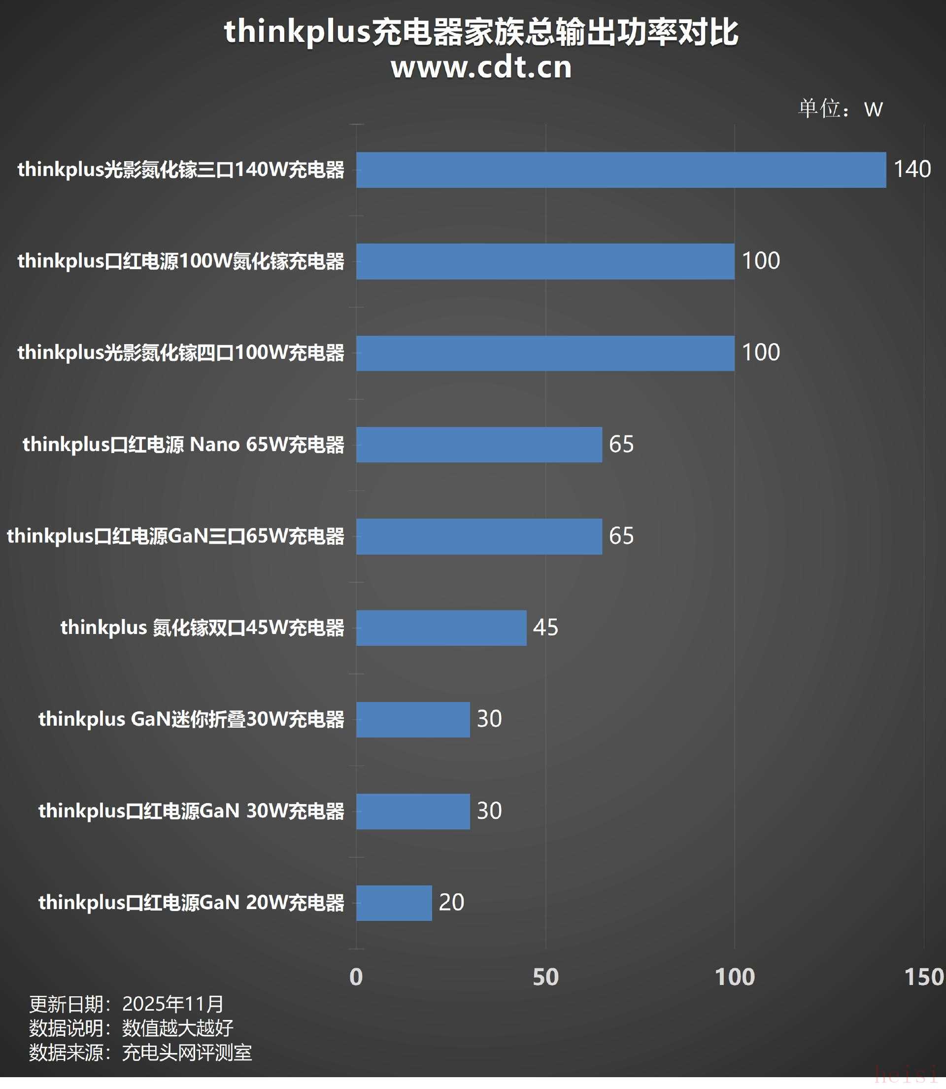 從條形圖可以看出 thinkplus 充電器家族每款的總輸出功率,主要覆蓋 20-30W、45-65W、10-100W-140W 多個(gè)檔位。其中 thinkplus 光影氮化鎵三口 140W 充電器在整個(gè)充電器家族中不管是協(xié)議支持、峰值功率、用料做工等都是第一梯隊(duì)。