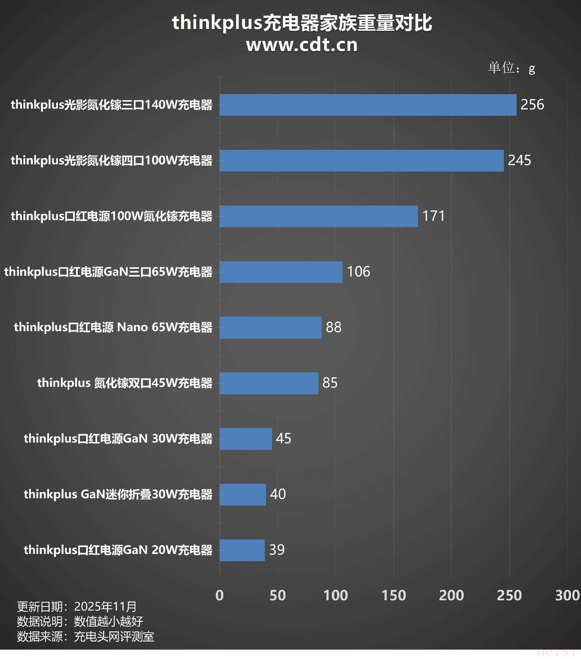 繪制出條形圖,可以看到 thinkplus 充電器家族每款產(chǎn)品的具體重量,重量最輕的是 thinkplus 口紅電源 GaN 20W 充電器,僅有 39g,最重的則是 thinkplus 光影氮化鎵三口 140W 充電器,重量達(dá) 256g。