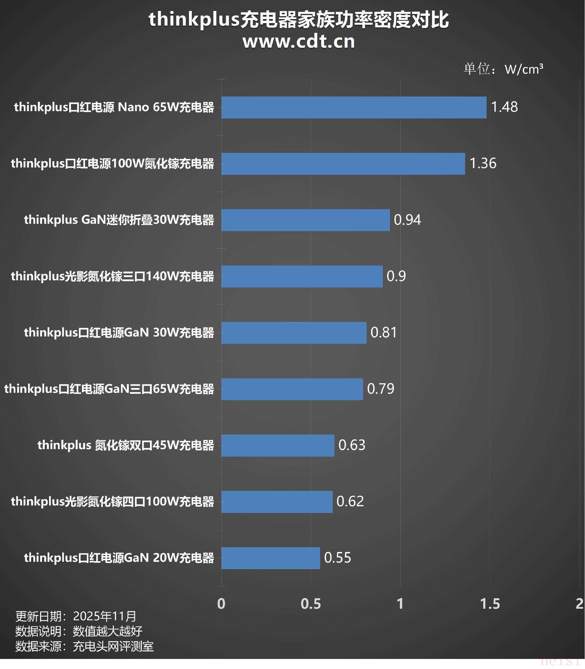 從條形圖可以看出 thinkplus 充電器家族的功率密度情況,功率密度最高是 thinkplus 口紅電源 Nano 65W 充電器,達(dá)到 1.48W/cm3,其內(nèi)部的平面變壓器和先進(jìn)的多 PCB 堆疊工藝功不可沒(méi);緊隨其后的口紅電源 100W 氮化鎵充電器同樣具備優(yōu)秀的功率密度,在保持袖珍體積的同時(shí)兼顧充電效率。