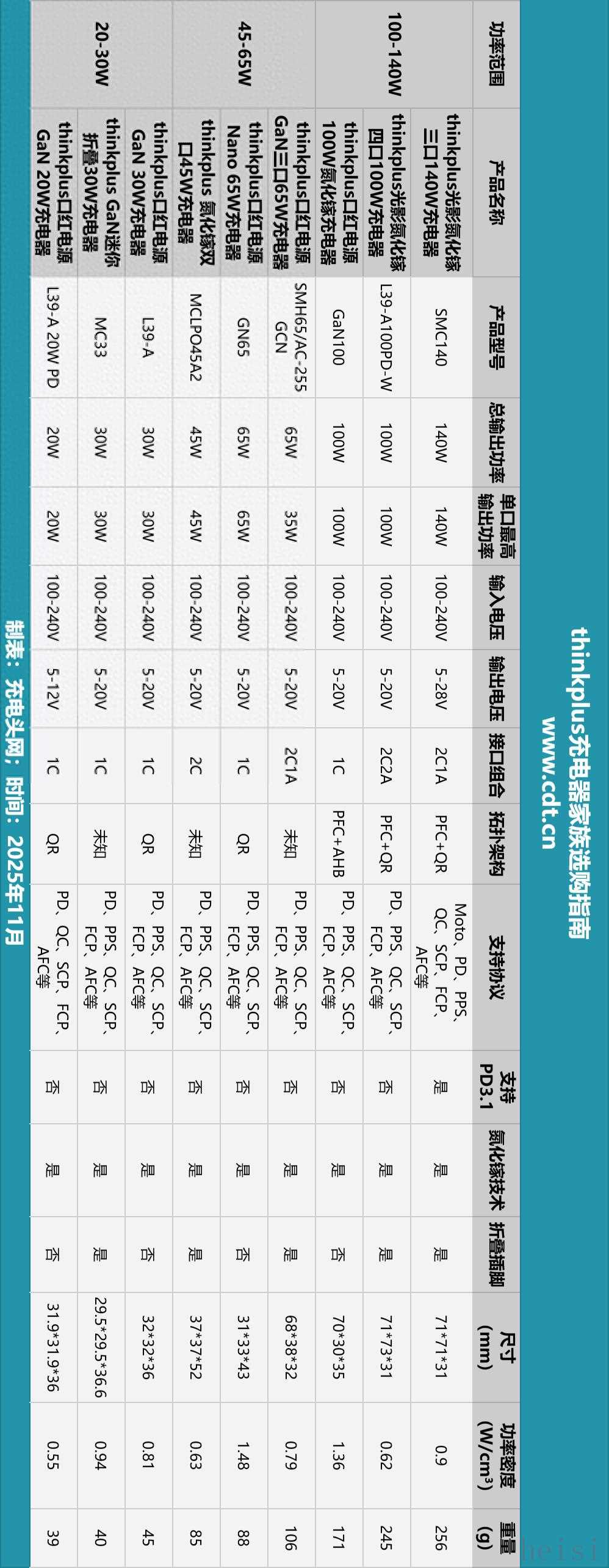 以上匯總了 thinkplus 在售的 9 款充電器,總輸出功率從 20W-140W 不等,覆蓋光影氮化鎵系列以及口紅電源等熱門(mén)系列產(chǎn)品,每款充電器具體的型號(hào)、總輸出功率、接口組合、支持協(xié)議、尺寸重量等信息都一并列出。