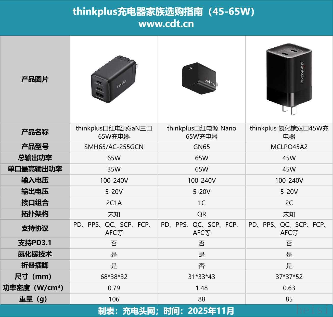 在 45–65W這中檔功率段,thinkplus面向針對(duì)不同細(xì)分場(chǎng)景推出了三款充電器,分別是兩款65W充電器和一款45W充電器,其中既有小體積單口極致輸出,也有兼顧多口充電和小巧便攜的場(chǎng)景。