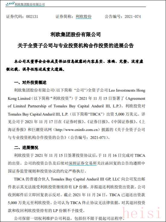 公告顯示,利歐股份認(rèn)為:TBCA終止協(xié)議無法律依據(jù),對其退回投資款和收回利歐投資持有的LP份額不予接受。公司保留一切權(quán)利維護(hù)公司利益,包括但不限于提起司法程序。