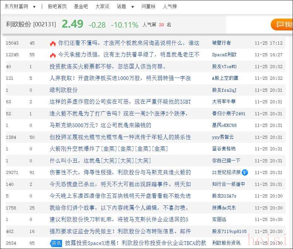 投資被退回的“尷尬事”發(fā)生后,利歐股份11月25日開盤一度跌停,截至收盤,利歐股份跌10.11%報2.49元,封上跌停板。投資Space X的這一系列操作,不僅讓利歐股份收到了深交所的關(guān)注函,也讓股民的質(zhì)疑聲日漸鼎沸。