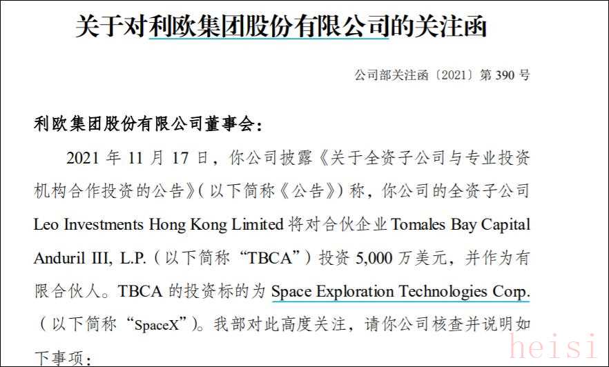 11月18日,深交所下發(fā)關(guān)注函,要求利歐股份于11月22日前補充披露TBCA的具體情況,包括但不限于基金規(guī)模、組織形式、出資方式、出資進(jìn)度、存續(xù)期限、退出機(jī)制等,并說明投資于Space X的具體安排及進(jìn)展情況等。
