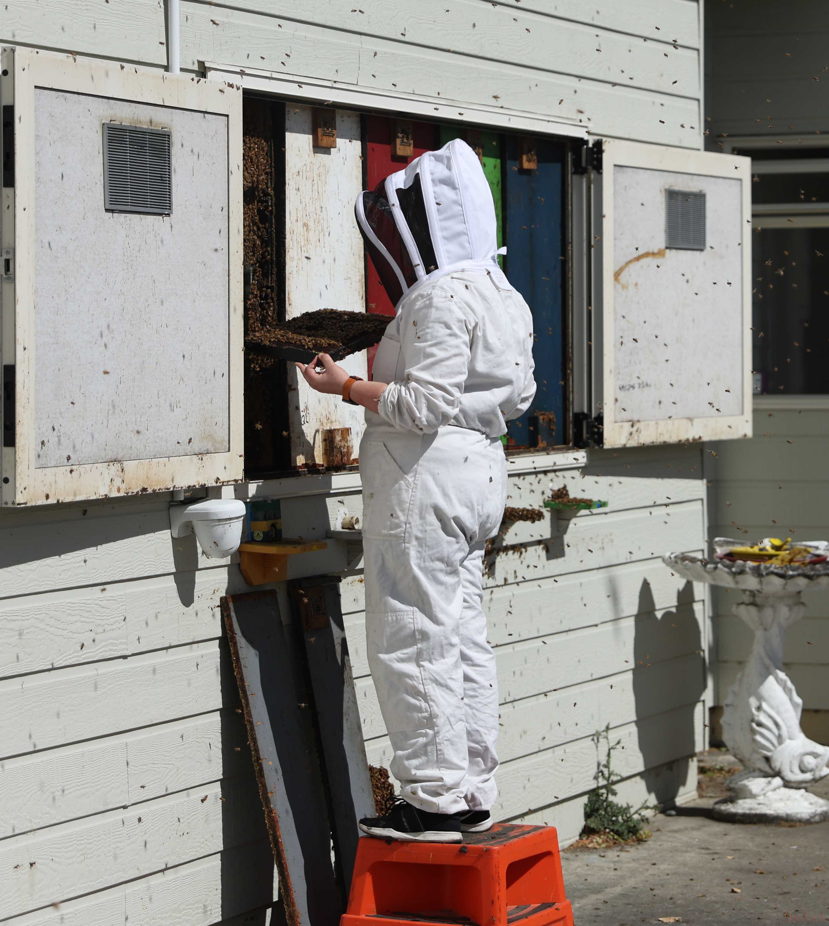 10月29日,在新西蘭北島一家蜂蜜生產(chǎn)企業(yè)的展示區(qū),工作人員檢查蜂后的健康狀態(tài)。新華社記者 龍雷 攝