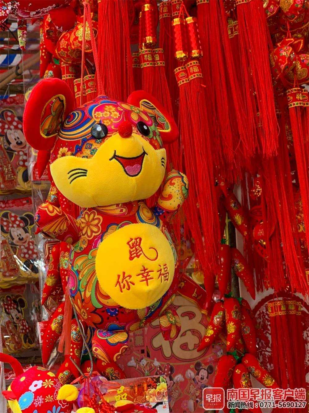 門貼、掛歷、服飾……鼠年新春將至,走在南寧各大賣場里,隨處可見鼠主題的商品占據(jù)了顯眼的位置。各種“萌鼠”已經(jīng)迫不及待附著在家電、玩具、頭飾等各類商品中。一些超市貨架上,擺上了繡有“數(shù)你最旺”字樣的紅色老鼠毛公仔,十分喜慶?!叭缫馐蟆薄案鉀_天鼠”……這些寓意美好的玩具,也讓市民有了更多選擇。1月10日,市民陳女士來到望州路上某大型超市,購買了好幾只老鼠玩具,“春節(jié)的時候可以送給親戚的孩子,挺喜慶的”。