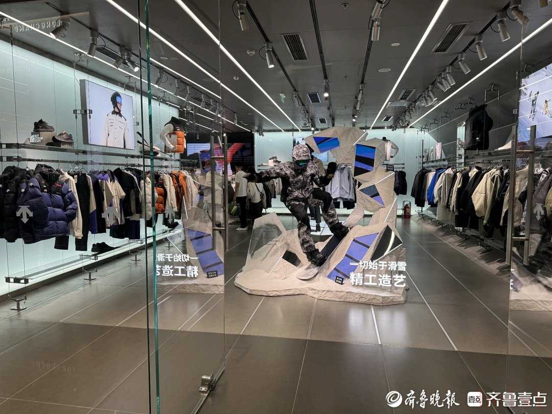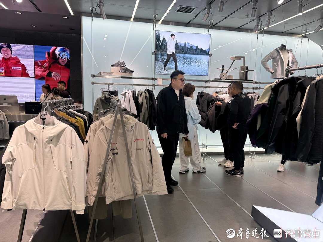 9月28日晚,雖正值工作日,但濟南萬象城迪桑特門店內(nèi),仍有十余組顧客在選購。入口處“一切始于滑雪” 的擺陳設(shè)計格外醒目,幾位消費者正圍著店員詢問沖鋒衣的防水情況?!斑@款面料非常防水,衣服兩側(cè)的拉鏈很有設(shè)計感,既可以通勤穿,也可以戶外運動?!钡陠T邊說邊演示。