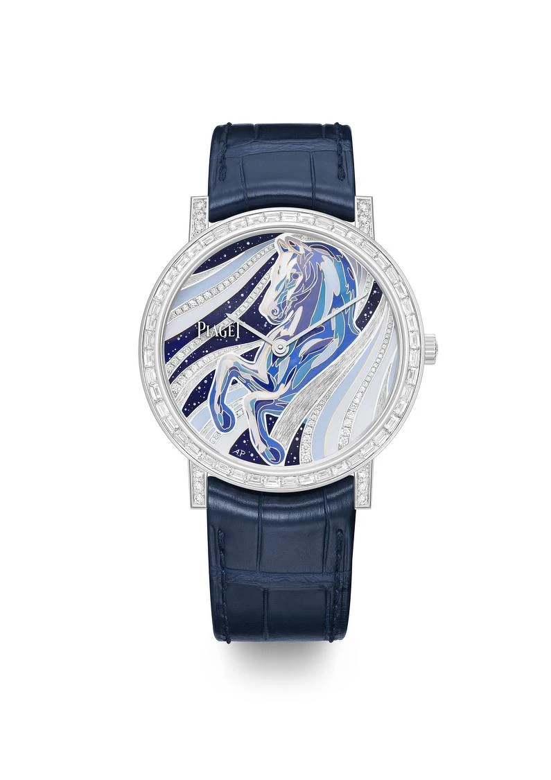 錶款技術(shù)資料:Altiplano系列大師工藝Métiers d'Art丙午馬年限定18K白金鉆石琺瑯超薄手動上鍊(CAL.830P)腕錶。錶盤描繪駿馬高速奔馳、淩空躍起沖破祥云的吉祥寓意,是由琺瑯工藝大師Anita Porchet以掐絲琺瑯工藝製作,藍(lán)色漸變白色釉彩的細(xì)膩安排,勾勒紋理線條與皮毛光澤,散發(fā)如夢似幻的靈動神韻。建議售價約NT$7,900,000