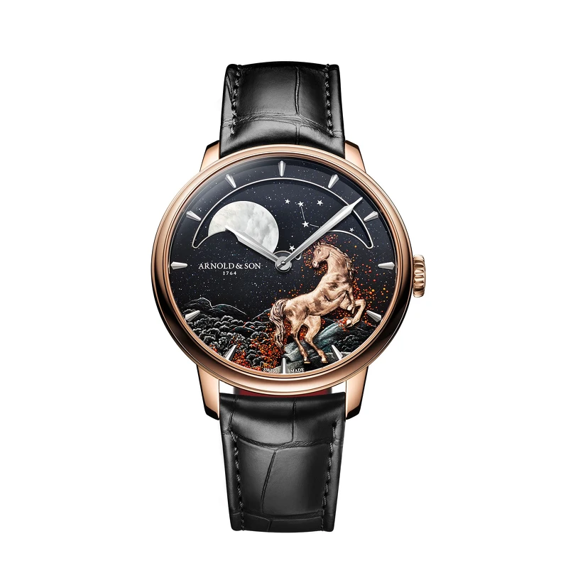 錶款技術(shù)資料:Perpetual Moon 41.5 Red Gold « Year of the Horse »限量錶,錶徑41.5毫米18K玫瑰金,黑色砂金石玻璃錶盤搭配手工雕刻駿馬立體裝飾、金粉手工彩繪與珍珠母圓盤月相視窗。搭載A&S1512,手動上鍊機(jī)械機(jī)芯、錶背第二月相顯示。全球限量8枚,參考售價 NTD $2,450,000(可能浮動)