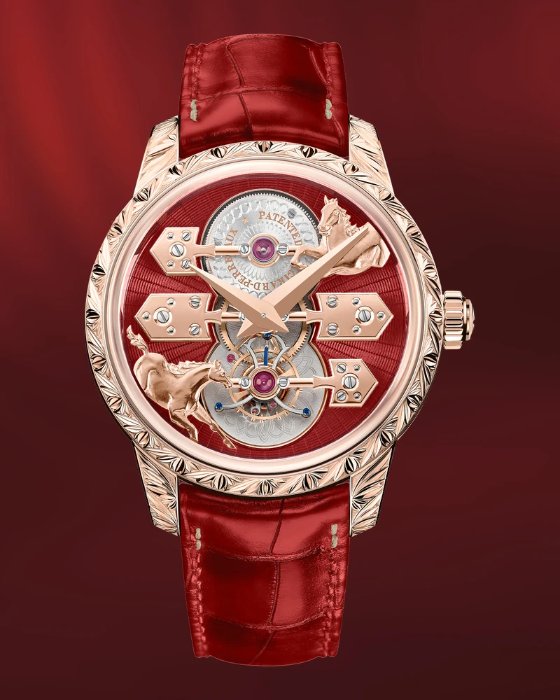 江詩丹頓延續(xù)以Métiers d’Art藝術(shù)大師系列The Legend of the Chinese Zodiac,今年全新推出兩款馬年生肖腕錶,每款限量各25枚。直徑40毫米錶殼搭載品牌自製2460 G4機(jī)芯,無指針式的時間顯示設(shè)計,得以讓面盤完整展現(xiàn)浮凸雕刻、微繪琺瑯與大明火琺瑯,多種工藝匯聚之美。