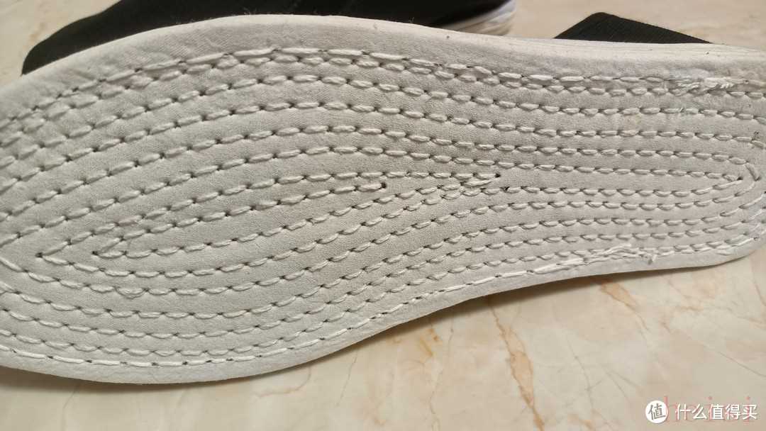 鞋底的走線應(yīng)該也都是機器完成,工整緊實,細節(jié)處還是有一些欠缺——比如我這雙鞋兩個膠底和布底粘貼位置就不太一樣,一雙前年布底更突出一塊,不過倒是不影響穿著。