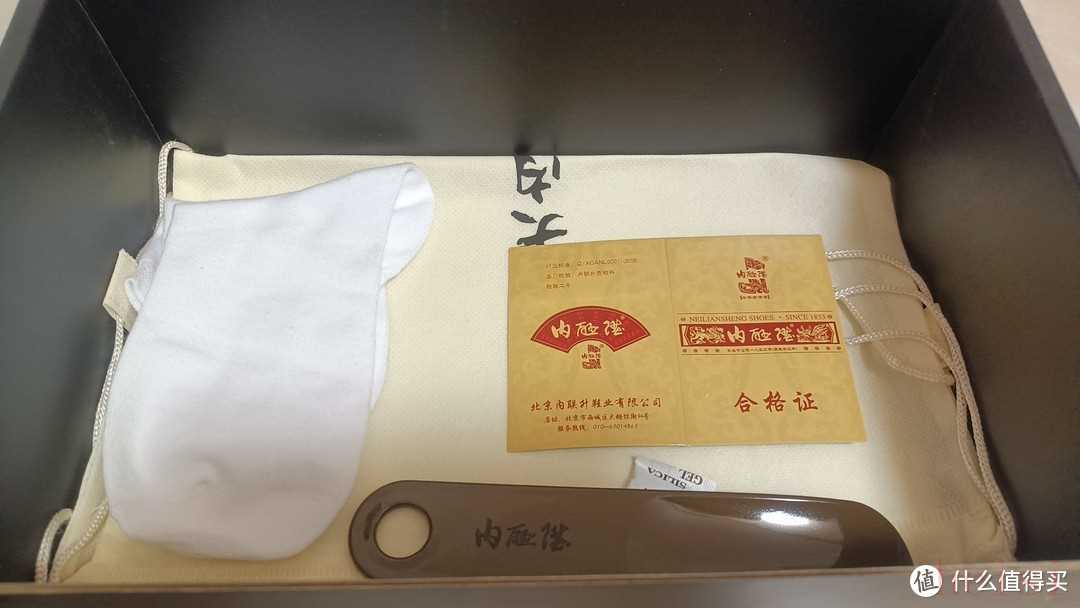 內(nèi)聯(lián)升的鞋盒,也是四雙鞋里唯一的硬質(zhì)的鞋盒。內(nèi)里附贈了鞋拔子,襪子和布袋,幾乎做到了面面俱到。