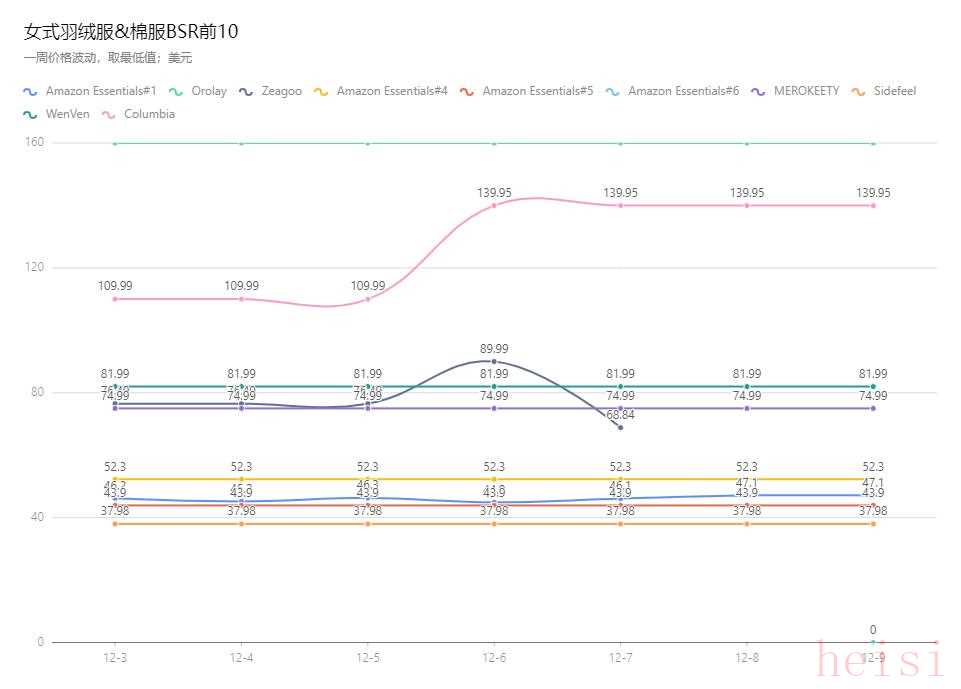 ·以近1周(2021年12月3日-2021年12月9日)為參考時(shí)間線,女式羽絨服&棉服小類目BSR排名前10的產(chǎn)品定價(jià)動態(tài)如下(部分產(chǎn)品有價(jià)格區(qū)間,取最低值,如某一鏈接定價(jià)為9.99美元-49.99,則取9.99美元):