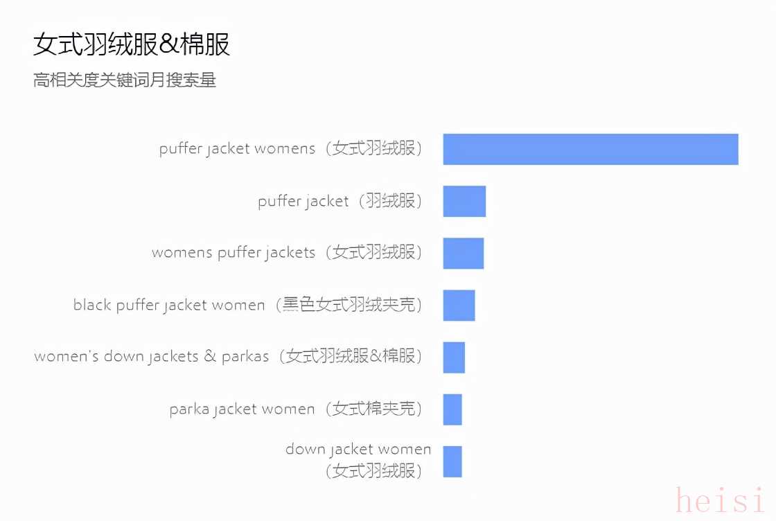 可以看到,以down jacket為主關(guān)鍵詞,關(guān)鍵詞搜索熱度排序依次為:down jacket(羽絨服)、down jacket men(男款羽絨服)、down jacket women(女款羽絨服)、packable down jacket woman(女款可折疊羽絨服)以及packable down jacket man(男款可折疊羽絨服)。