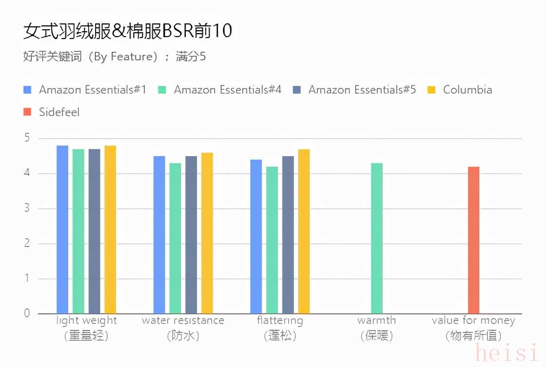 在對女式羽絨服&棉衣BSR榜單排名前10的鏈接評論(By Feature)進(jìn)行整理分析后可得: