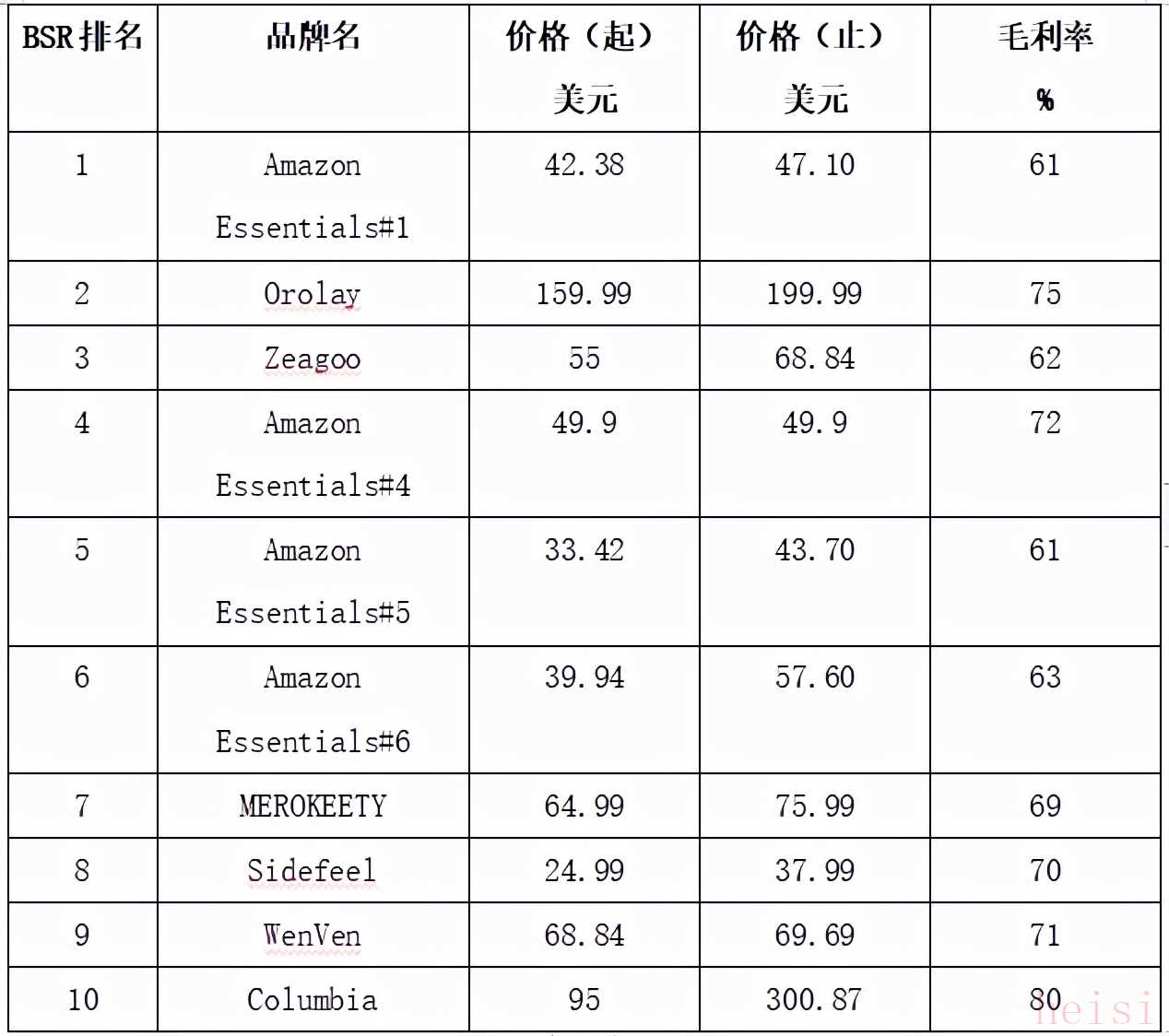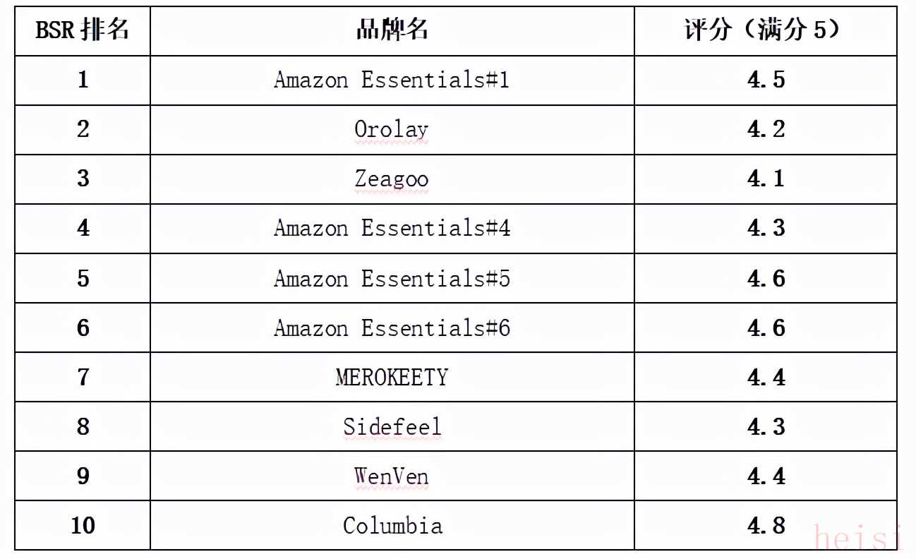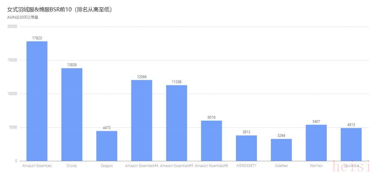 以亞馬遜美國站為例,女式羽絨服&棉服小類目BSR前10名中,總共有6家店鋪(品牌),分布情況如下: