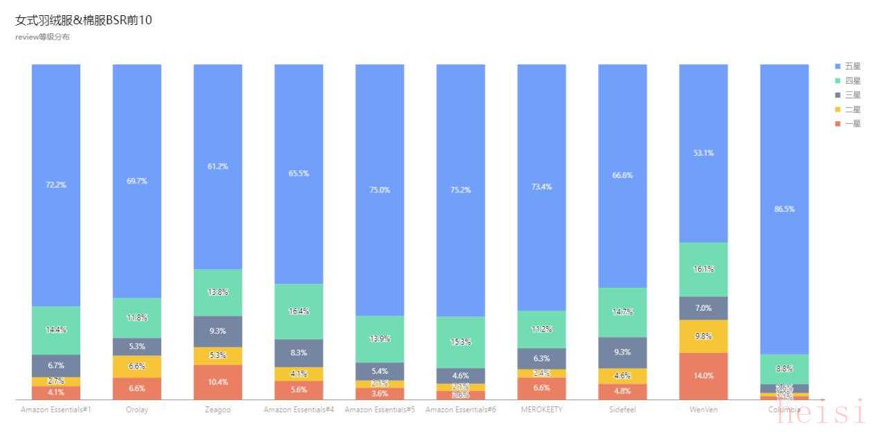 ·羽絨服&棉服BSR前10名review等級分布如下:
