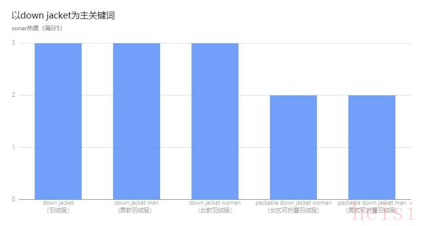 撰文期間,筆者以down jacket為主關(guān)鍵詞,亞馬遜美國站為搜索數(shù)據(jù)基礎(chǔ),在Sonar(亞馬遜關(guān)鍵詞工具,熱度滿分5)進(jìn)行檢索,結(jié)果如下: