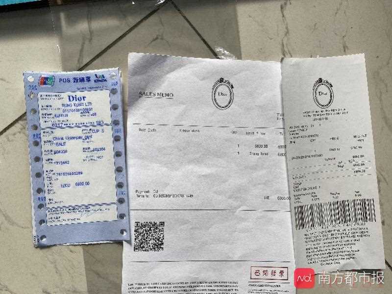 而在檔口旁邊的“太佳士多店”,名牌鞋的包裝盒正在公開(kāi)售賣(mài)。記者隨機(jī)購(gòu)買(mǎi)了幾套“大牌”包裝。僅僅花費(fèi)5元,就能得到一套知名牌子的外包裝,內(nèi)含小票、證書(shū)和簽購(gòu)單。比如,Dior包裝里小票顯示,該產(chǎn)品“價(jià)格”為6800港元,免稅;POS簽購(gòu)單上,還有卡號(hào)、交易類(lèi)別、商戶(hù)名稱(chēng)編號(hào)等信息。GUCCI的購(gòu)票憑證單蓋著紅色印章,提示從GUCCI香港直屬專(zhuān)門(mén)店購(gòu)買(mǎi)的貨品不能在大陸直屬專(zhuān)門(mén)店退換。