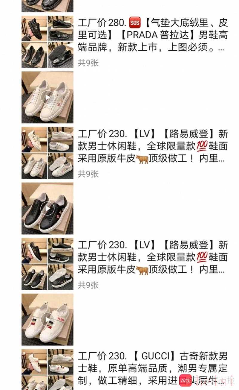 檔口老板的微信朋友圈充斥著名牌奢侈品牌鞋子的圖文推薦,宣傳其工廠(chǎng)價(jià)低至200元左右。“工廠(chǎng)直銷(xiāo),價(jià)格優(yōu)勢(shì)”是他們亮出來(lái)的廣告語(yǔ)。