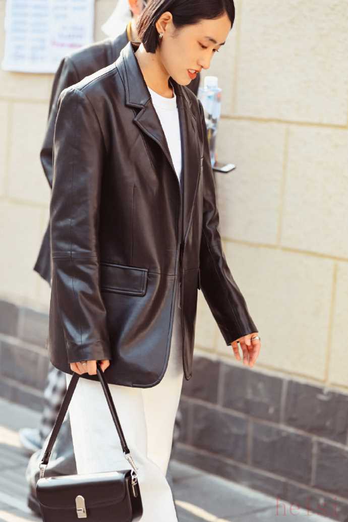 比如,偏廓形的皮質(zhì)西服,與黑色真皮包包呼應(yīng),整體簡(jiǎn)約的黑白色造型,看似簡(jiǎn)約卻十分顯貴,演繹出了less is more的高級(jí)感。