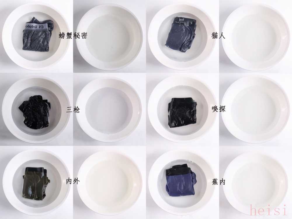 畢竟是私密部位的衣物,如果穿了褪色多不放心!用內(nèi)衣褲專用劑“洗樹”揉搓并靜置15分鐘后,六款內(nèi)褲的褪色度和掉纖維狀況對比就出來了。其實(shí)以本測評員的肉眼識(shí)別能力來講,六款內(nèi)褲基本都沒怎么掉色。但是掉纖維狀況已經(jīng)很明顯了,三槍尤其嚴(yán)重,盆里的水因?yàn)榈撞坷w維的映襯都有點(diǎn)變藍(lán)調(diào)了。其余幾款也都有些許掉纖維的情況,但是是可以接受的程度。貓人最優(yōu)秀!所掉纖維幾乎可以忽略不計(jì)。