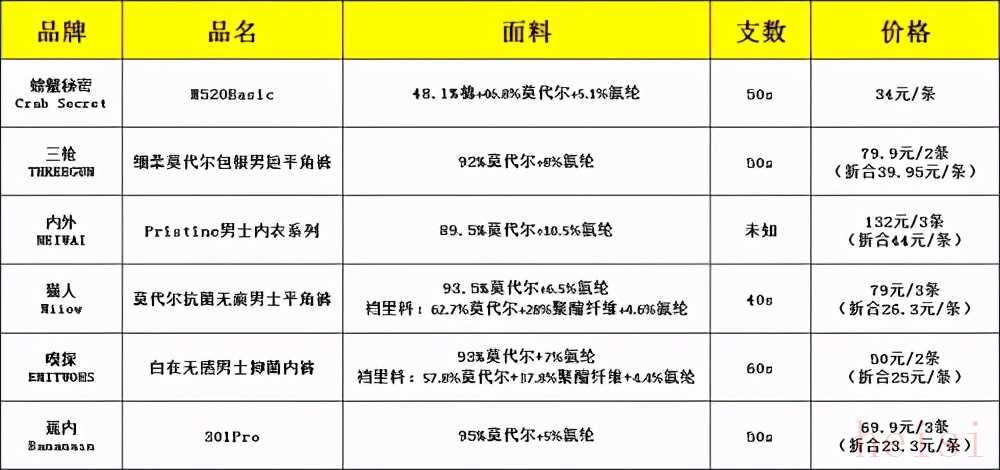 我們在茫茫莫代爾面料的男士內(nèi)褲中,精選了6款比較有代表性的品牌內(nèi)褲作為本次的測評樣品,它們分別是:螃蟹秘密M520Basic、三槍細(xì)柔莫代爾包根男短平角褲、內(nèi)外Pristine系列、貓人莫代爾抗菌無痕男士平角褲、嗅探自在無感男士抑菌內(nèi)褲、蕉內(nèi)301Pro。