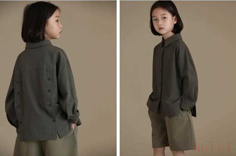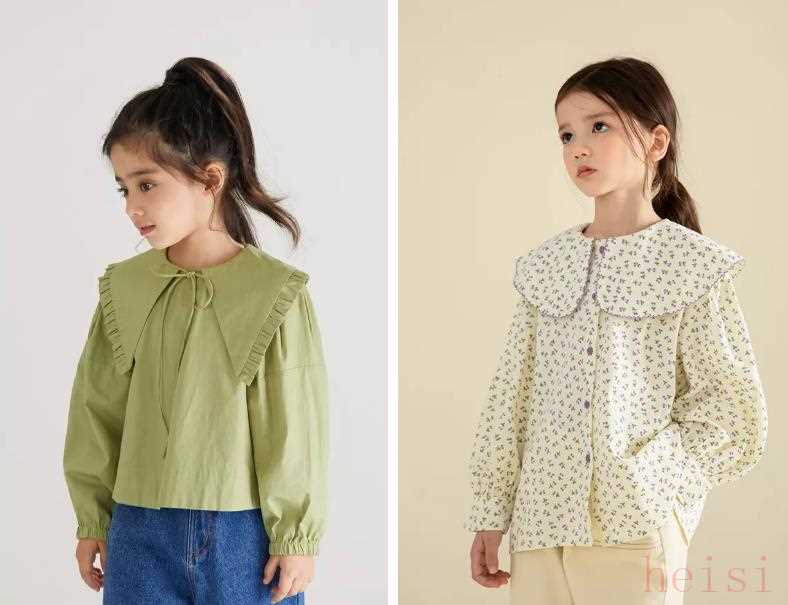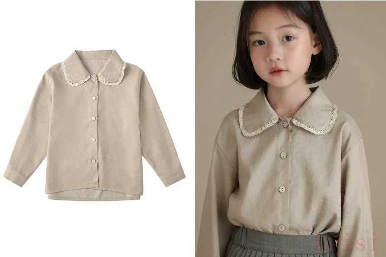 童裝的襯衫娃娃領(lǐng)占多數(shù),看起來乖萌乖萌的。這件搭配了小蕾絲,乖巧指數(shù)再上一層樓。好在顏色足夠素顏,上身并不會覺得太裝嫩。