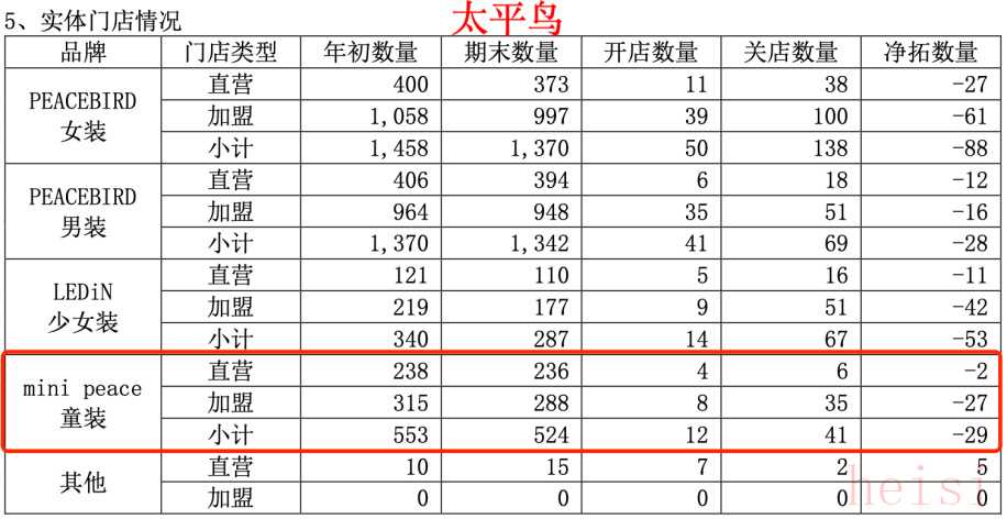 從財(cái)報(bào)中可見,太平鳥在上半年的線下銷售渠道(直營+加盟)營收22.32億元,同比減少了14.5%。反應(yīng)到門店數(shù)量上,太平鳥的實(shí)體門店(包括加盟、直營,四大主要品牌及其他品牌)新開124家,關(guān)閉317家,總共減少193家。其中,mini peace童裝實(shí)體門店的直營和加盟凈拓減少29家店。