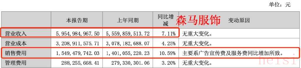 其中,森馬服飾在報(bào)告期內(nèi)的銷售費(fèi)用同比增加10.59%至15.49億元,占總營收26.02%。主要系廣告宣傳費(fèi)及服務(wù)費(fèi)同比增加所致:廣告宣傳費(fèi)3.25億元,為新開店鋪宣傳費(fèi)用增加以及線上流量投入增加;服務(wù)費(fèi)4.40億元,為直播服務(wù)費(fèi)同比增加。但總營收卻只有59.55億元,同比增長7.11%。這意味著,森馬服飾銷售費(fèi)用增長帶不來與之相匹配的營收增長。