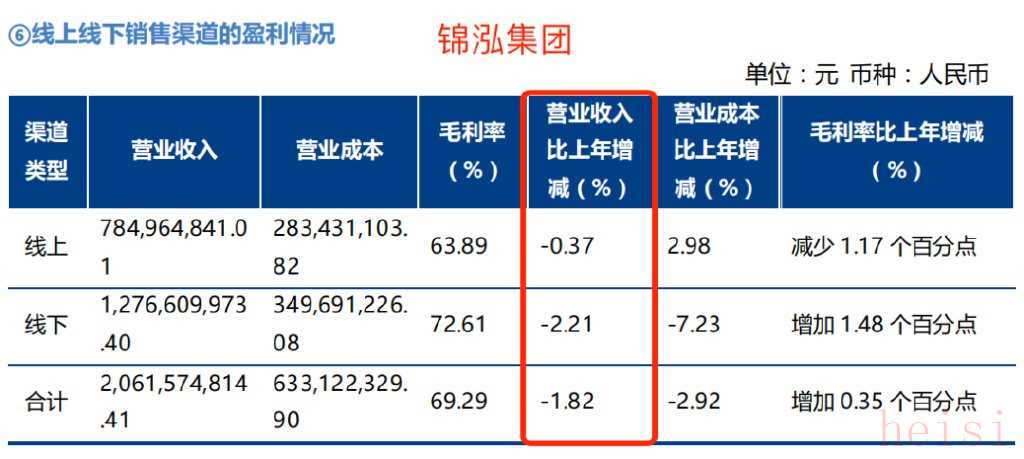 而錦泓集團(tuán)線下渠道整體營收同比減少2.21%至12.77億元,反映在線下分區(qū)域情況上,就是7個大區(qū)只有華東實(shí)現(xiàn)盈利,同比增長9.09%。與此同時,線上渠道整體營收也不佳,營收同比減少0.37%至7.48億元。