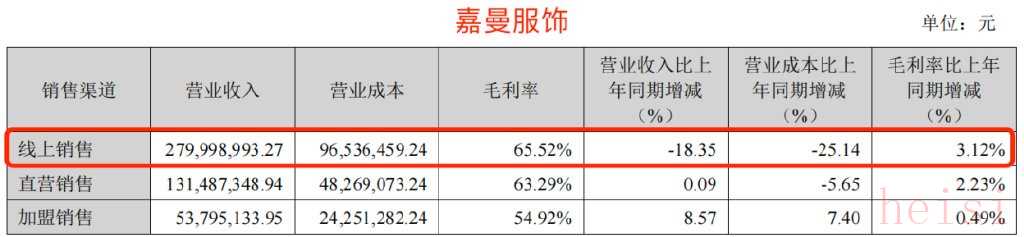 細(xì)觀二者的銷售渠道也十分相似,均是在線上、線下有所布局,且分為直營、聯(lián)營和加盟。其中,嘉曼服飾在報(bào)告期內(nèi)的主要營收來自于“線上”,貢獻(xiàn)了2.80億元占服裝業(yè)務(wù)總營收的60.18%。但相較于去年同期,這一渠道的收入減少18.35%。對此,嘉曼服飾稱是因?yàn)榭刂屏似煜缕放频匿N售折扣力度所致。那這是否意味著,在折扣力度減小的情況下,線上渠道的銷售就必然面臨挑戰(zhàn)呢?