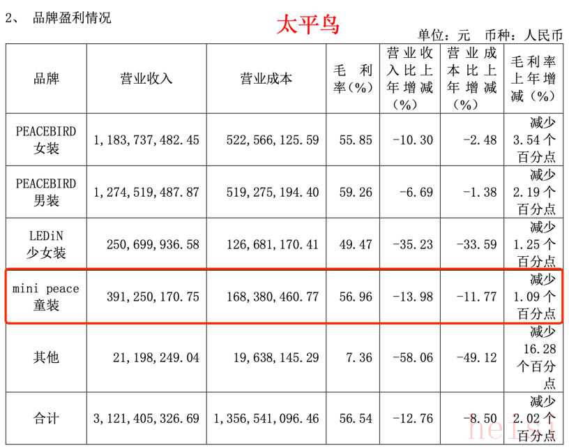 而剩余6家服裝企業(yè),分別為太平鳥、探路者、森馬服飾、錦泓集團(tuán)、361度、江南布衣,都是在原有成人裝的基礎(chǔ)上延伸發(fā)展童裝。在這其中,唯有太平鳥童裝品牌mini peace營收同比減少13.98%至3.91億元,占總營收的12.48%。