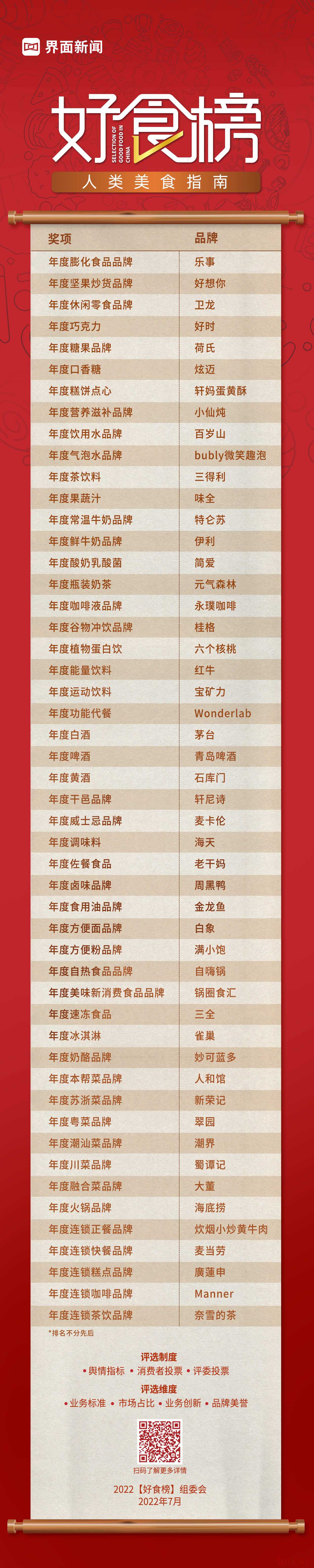 在此背景下,由上海報(bào)業(yè)集團(tuán) | 界面新聞發(fā)起的2022【好食榜】評(píng)選再度啟動(dòng)。此次評(píng)選覆蓋全食品行業(yè),通過(guò)榜單形式表彰優(yōu)秀食品品牌,為好食者提供美食指南;同時(shí),為食品行業(yè)未來(lái)的可持續(xù)發(fā)展點(diǎn)亮燈塔,致敬他們?cè)谛孪M(fèi)生態(tài)下,堅(jiān)守食品品質(zhì)之余在積極創(chuàng)新、推動(dòng)行業(yè)新趨勢(shì)方面做出的超群貢獻(xiàn)。