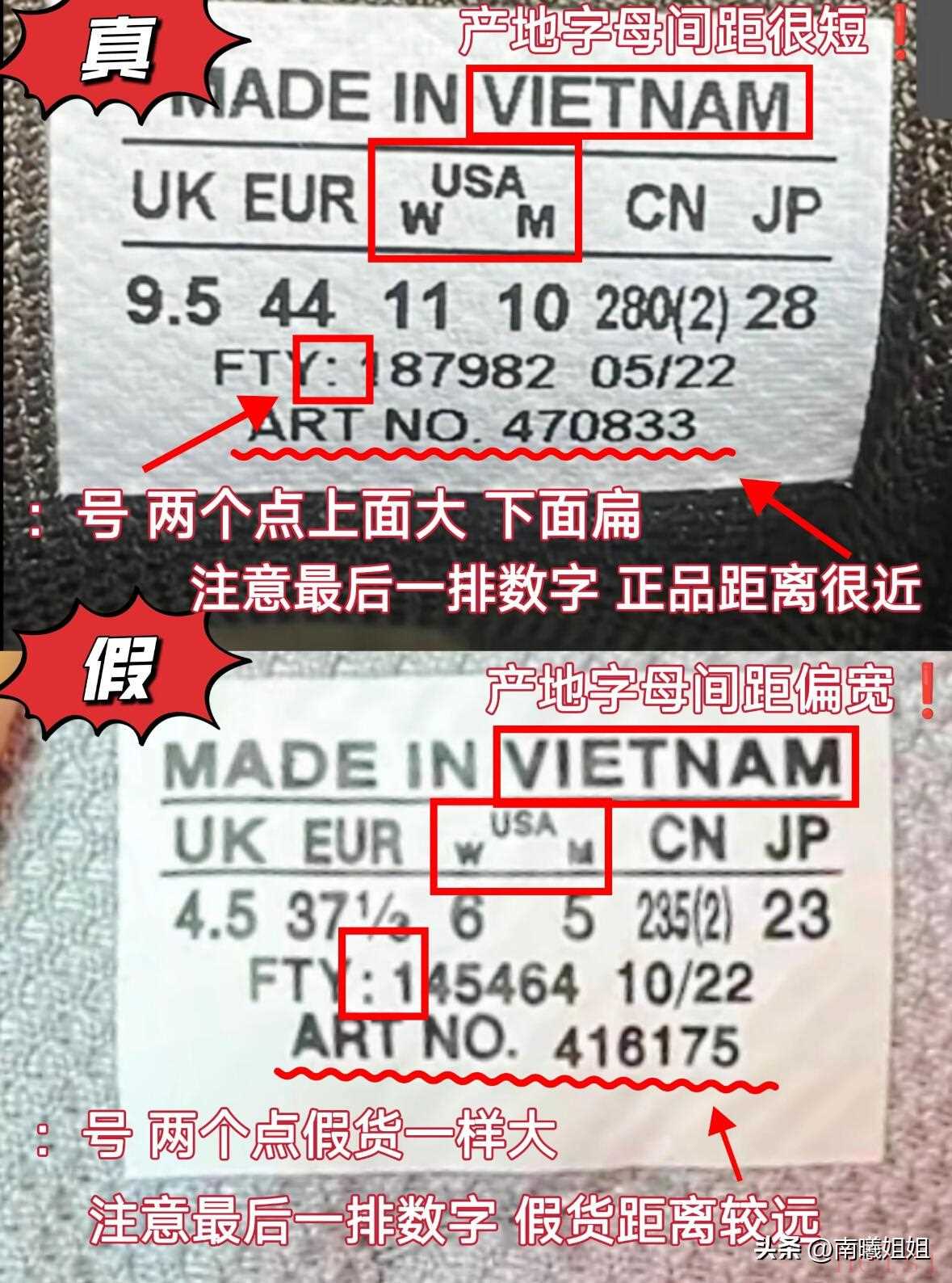 正品的薩洛蒙,水洗標(biāo)上的產(chǎn)地字母間距很短,而且冒號(hào)兩個(gè)點(diǎn)上面大下面扁,最后一排數(shù)字的距離比較近,反觀假貨,冒號(hào)兩個(gè)點(diǎn)一樣大,最后一排數(shù)字距離較遠(yuǎn),看上去特別稀疏廉價(jià)。