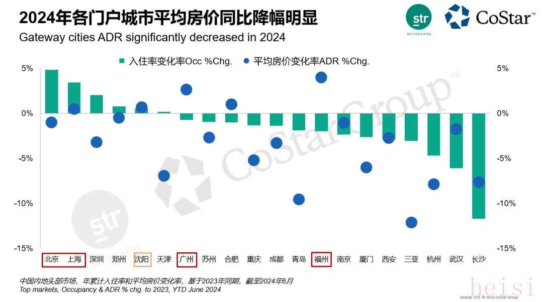 STR數(shù)據(jù)顯示,2024年華中各門戶城市平均房價同比降幅明顯,入住率相對疲軟。