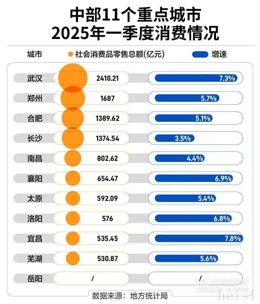 21世紀經(jīng)濟研究院曾梳理了武漢、鄭州、合肥、長沙、南昌、襄陽、太原、洛陽、宜昌、岳陽、蕪湖等11座重點城市2025年一季度社會消費品零售總額數(shù)據(jù)。