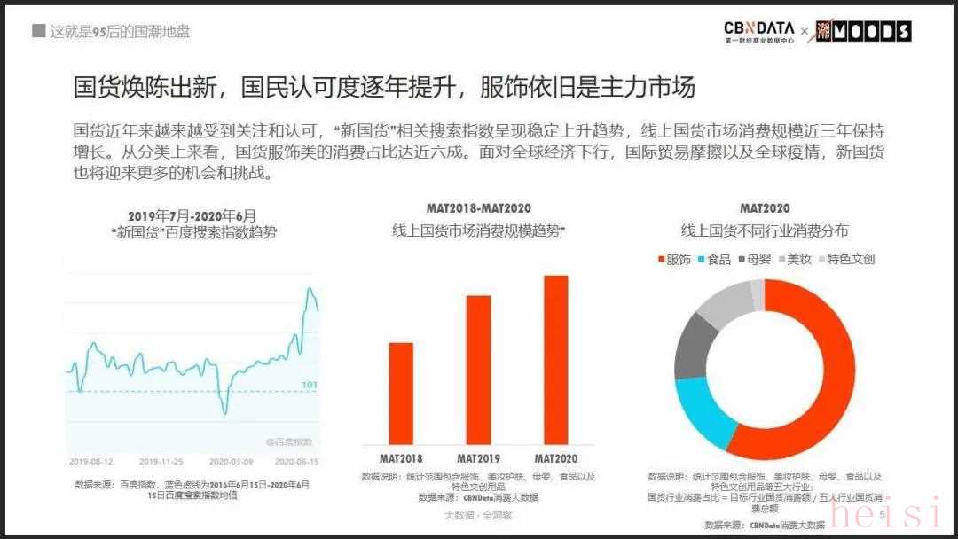 先從消費(fèi)端看。近年消費(fèi)者對國潮的追捧熱度在不斷上升, “國潮”關(guān)鍵詞搜索在過去十年間上漲了528%。CBNData《報告》也顯示,“新國貨”搜索指數(shù)呈現(xiàn)穩(wěn)定上升趨勢,線上國貨市場消費(fèi)規(guī)模近三年保持增長。其中,服飾約占線上國貨整體消費(fèi)規(guī)模的60%,是國貨消費(fèi)主陣地?!?0后”年輕一代成為潮流服飾消費(fèi)主力軍。