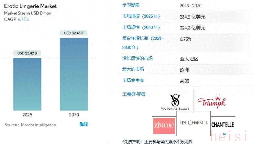 根據Mordor Intelligence數據顯示:2025年,全球情趣內衣市場規(guī)模預計為234.2億美元;截至2030年預計將達到324.3億美元;2025-2030年預測期內的復合年增長率為6.73%。