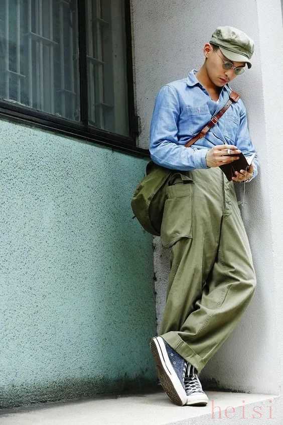 軍綠色的工裝闊腿褲搭配襯衫,加上一雙青春時髦的帆布鞋,造型復(fù)古工裝風(fēng)就立馬呈現(xiàn)出來,褲子寬松直筒的效果讓造型豐富大氣。