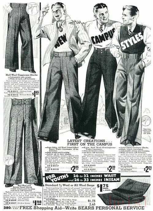 這種高腰闊腿西褲一直流行到50年代末,從60年代開始男士褲子的版型逐漸開始多元化。受街頭時尚的影響,當(dāng)時對其他款式的褲子接受程度也很強,從而削弱了闊腿褲的熱度,但在女性時尚中這條闊腿褲就一直很流行。
