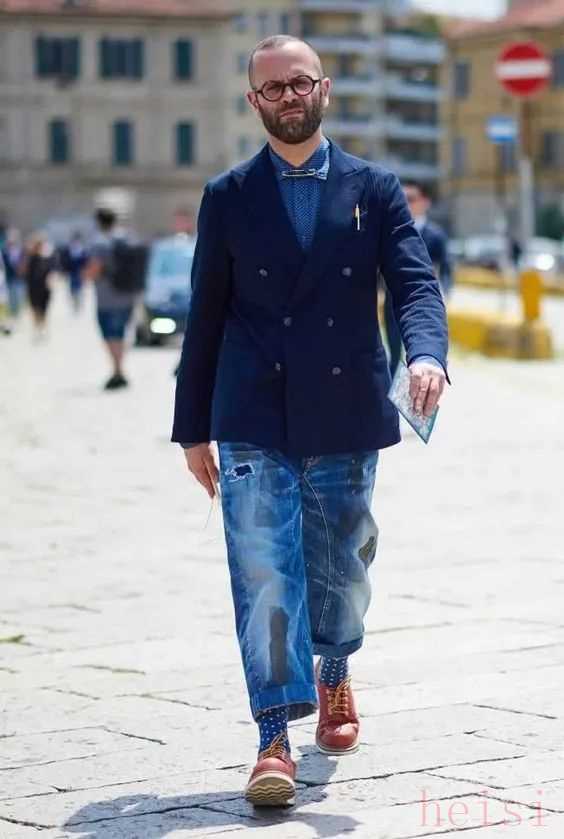 寬松款式的牛仔褲搭配西裝打造藍(lán)色調(diào)造型,雖然牛仔褲款式很個性,但和優(yōu)雅的西裝組合起來造型也很協(xié)調(diào),加上一雙棕色的皮鞋造型也顯得很沉穩(wěn)。