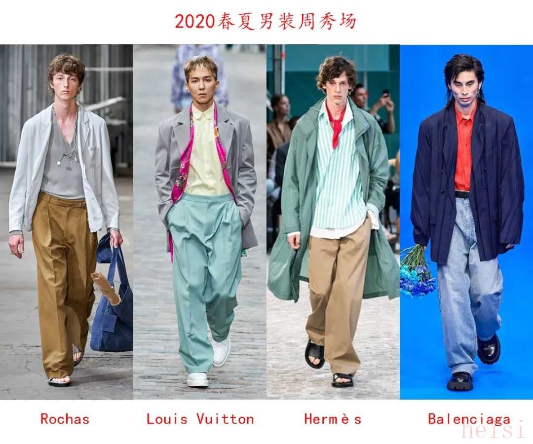 風(fēng)格潮流的發(fā)展離不開時裝品牌的推動,在2020春夏男裝秀場發(fā)布會中,各大品牌都有推出闊腿褲系列,形成一種時尚趨勢。畢竟時裝品牌不但能抓住流行元素,而且能創(chuàng)造出流行趨勢,時尚圈中很多潮流就是源于秀場。
