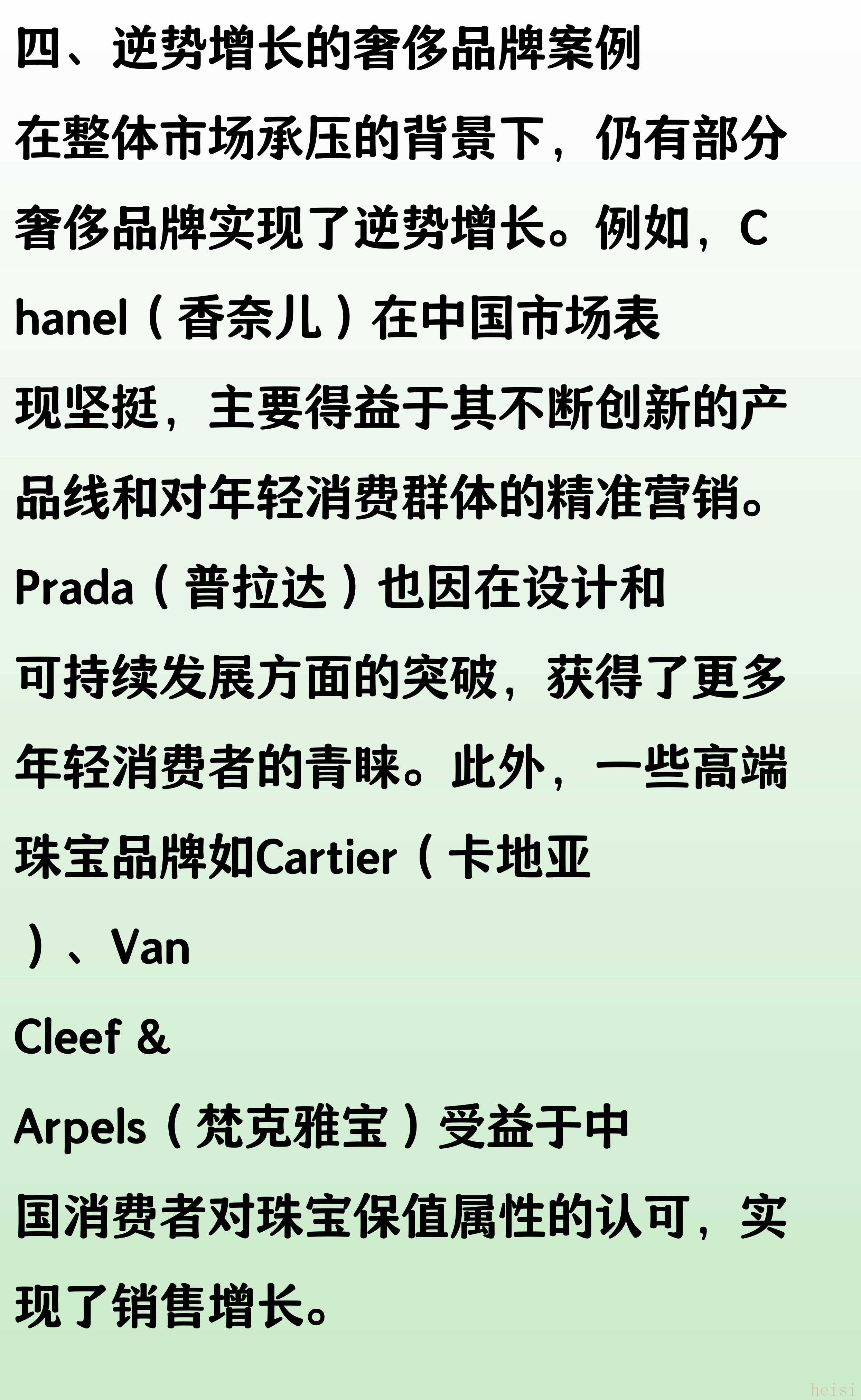 "新興設(shè)計(jì)師品牌:" 如Coach、Michael Kors等輕奢品牌通過高性價(jià)比、快速更新和強(qiáng)大的營銷網(wǎng)絡(luò),搶占了部分市場份額。
