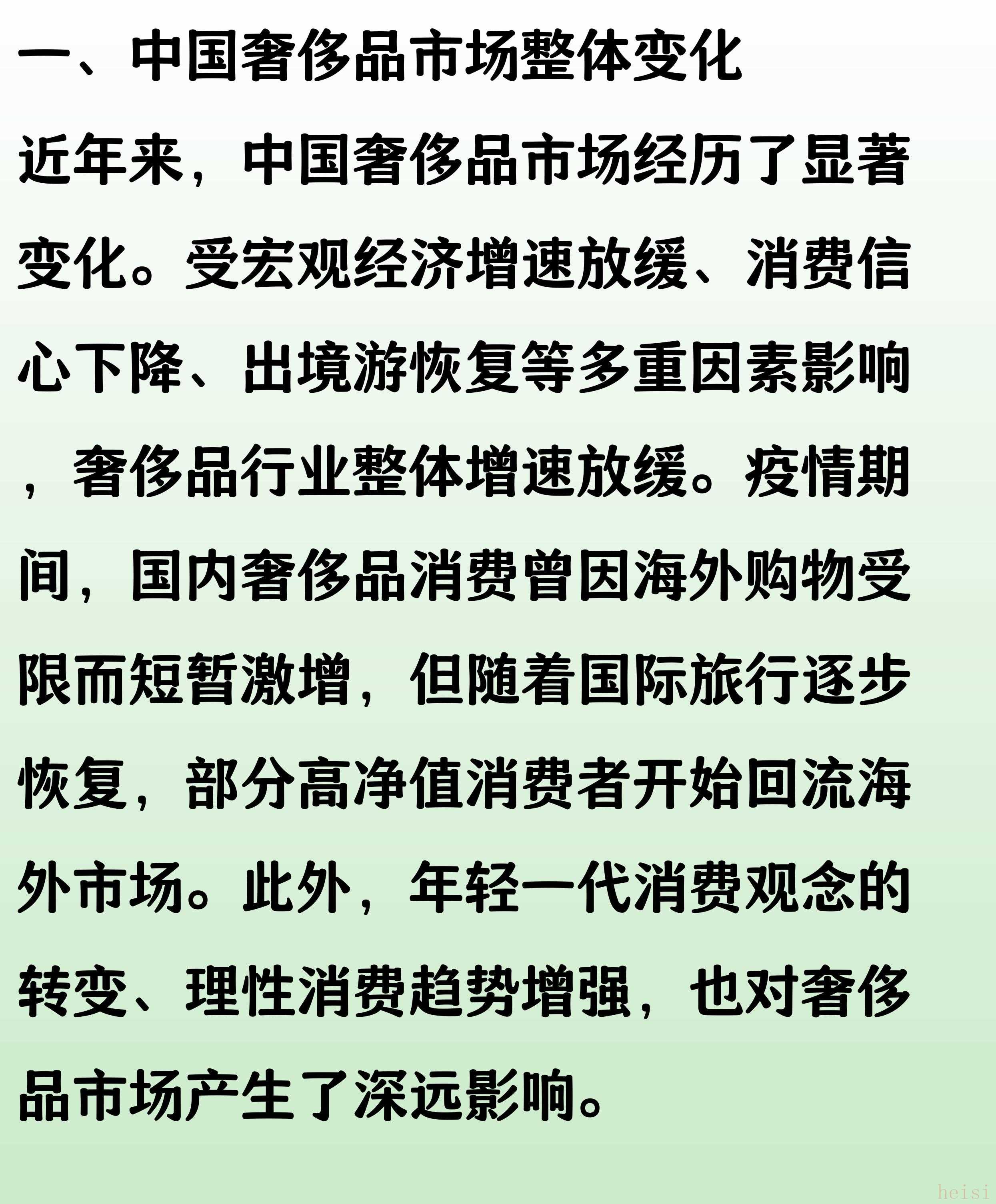 1. "宏觀經(jīng)濟(jì)環(huán)境:" 中國經(jīng)濟(jì)增長放緩,以及疫情反復(fù)對(duì)消費(fèi)信心和線下購物體驗(yàn)的影響,使得部分消費(fèi)者更加謹(jǐn)慎,對(duì)非必需的高單價(jià)商品需求減弱。