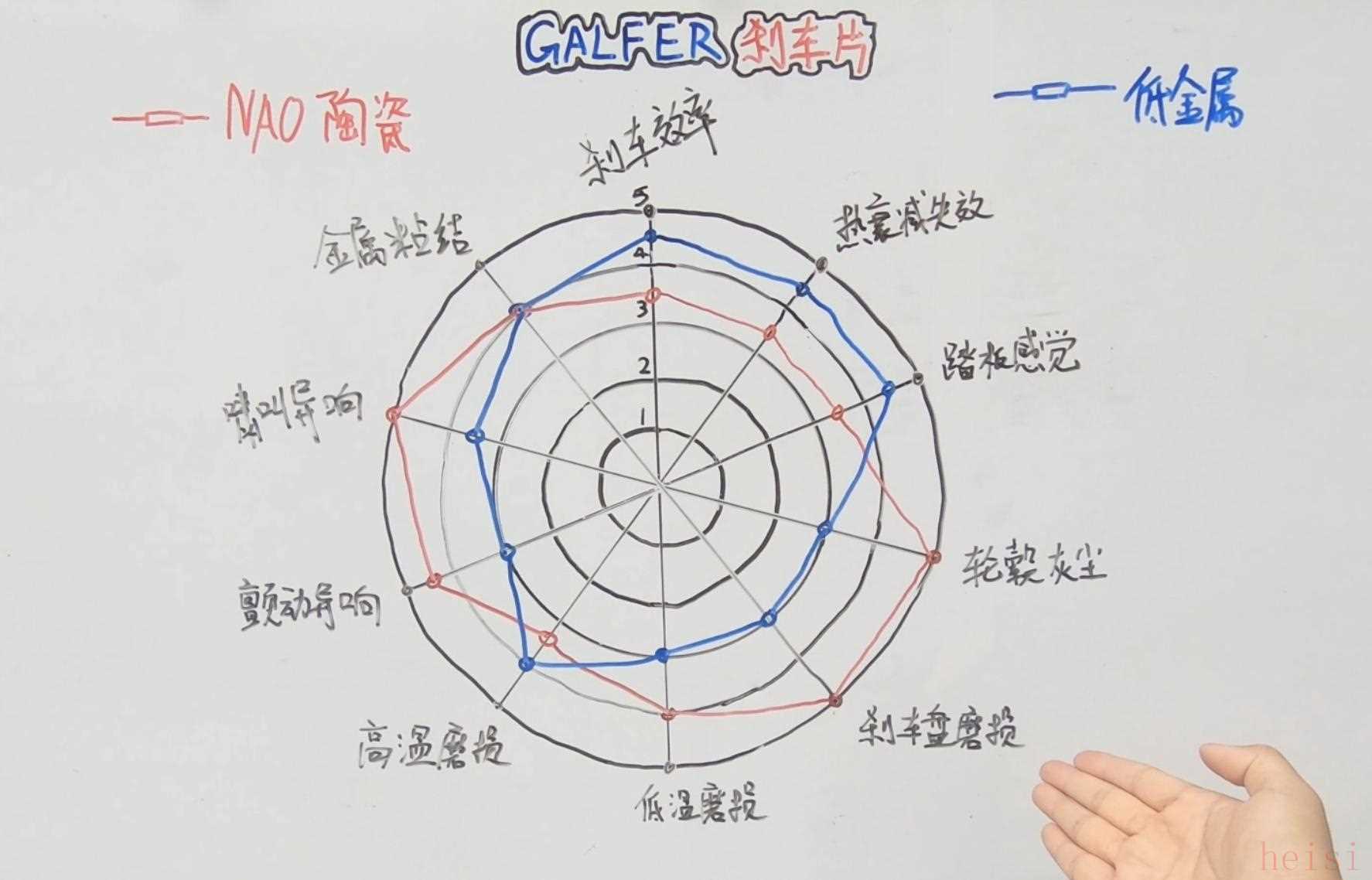 為了能夠更加直觀地讓大家來理解這兩種剎車片材質(zhì)的優(yōu)缺點(diǎn),我畫了一個(gè)網(wǎng)狀對(duì)比圖來和大家聊一聊。它們分別對(duì)比的參數(shù)有剎車效率、熱衰減失效、踏板感覺、輪轂灰塵,剎車盤磨損,剎車片的低溫磨損,剎車片的高溫磨損、顫動(dòng)異響、嘯叫異響和金屬粘結(jié),也就是剎車片生銹。