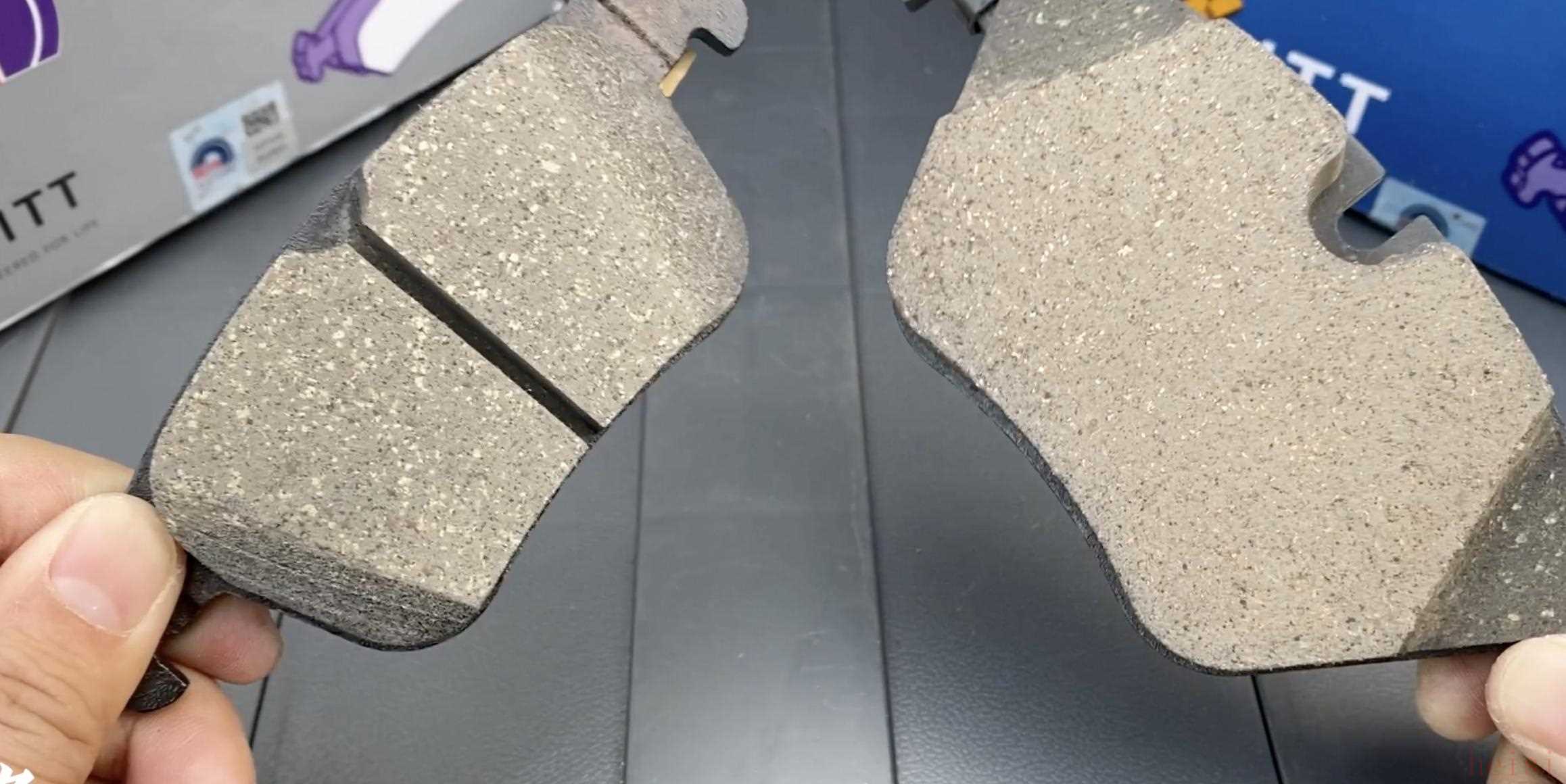 上圖中是兩塊不同材質(zhì)的剎車片,都是來自噶爾法的原廠配套產(chǎn)品,直接從原車上拆下來的。右邊是寶馬5系的低金屬剎車片,左邊是本田 NAO陶瓷剎車片。